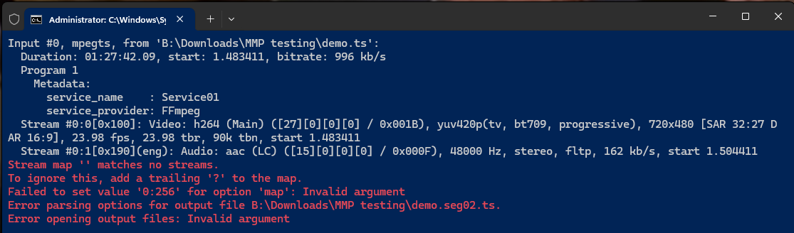 Timeline Editor, FFmpeg might report an error when extracting one or more segments of the video fileRerun button will display something similar to this [contrived example]:FFmpeg error messages can seem daunting, the solution to this one, and several others, is to simply have FFmpeg make its own copy of the video fileFFmpeg reads and rewrites all the streams it finds. This can often correct problems caused by some video-creation software