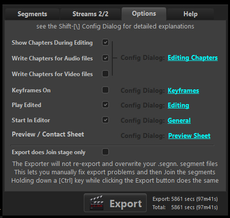 • fixed a minor issue when exporting one single segment where you end up with both the exported segment and the final edited file, both of which are identical. This wastes disk space. The functionality to simply rename the one exported segment to the final edited file got lost during the many v6.0.0 enhancements. It has been restored